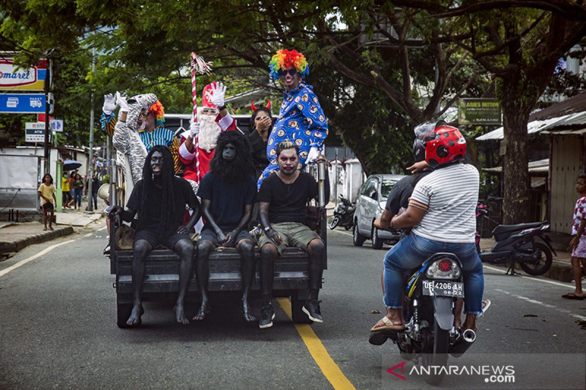 Sejumlah anggota Angkatan Muda Ranting 6 Cabang Bethel Ambon melaksanakan tradisi Santa Claus dengan mobil bak terbuka di Kota Ambon, Provinsi Maluku, Minggu (5/12/2021). Pemerintah Kota Ambon kembali mengizinkan tradisi Santa Claus menyambut perayaan Hari Raya Natal karena kasus COVID-19 melandai dan Ambon dalam kategori PPKM Level 1. (ANTARA FOTO/FB Anggoro)