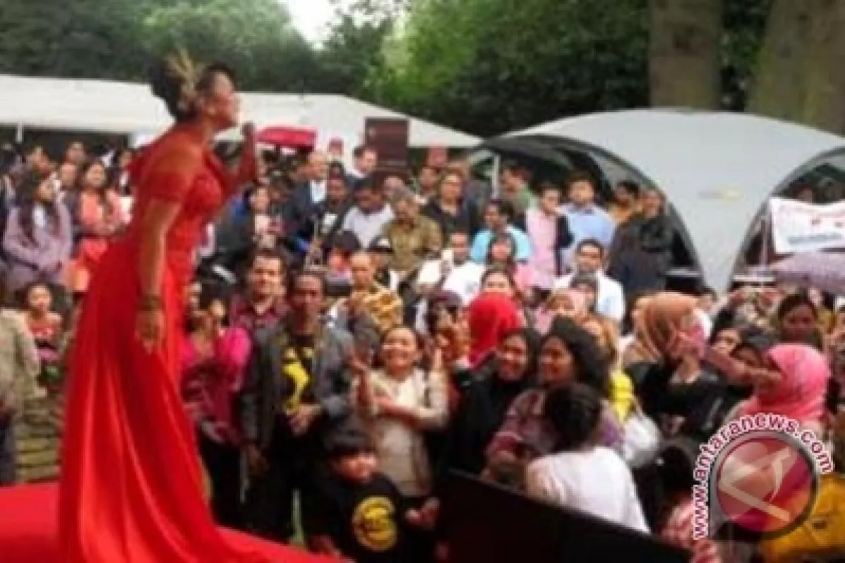 Dengan mengenakan busana brokat warna merah hasil rancangan sendiri, Echa Paramitha menyapa pengunjung yang memenuhi halaman belakang Wisma Nusantara dengan berbagai bahasa daerah.