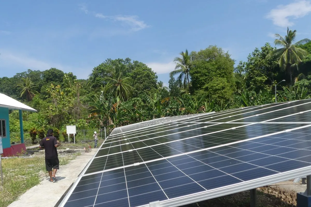 Warga berjalan melintasi kawasan Pembangkit Listrik Tenaga Surya (PLTS) di Pulau Tiga, Kecamatan Leihitu, kabupaten Maluku Tengah, Maluku, Kamis (31/10/2024). PLTS tersebut menyediakan sumber energi bersih yang ramah lingkungan dengan kapasitas 75 kWp untuk memenuhi kebutuhan tenaga listrik kepada 70 kepala keluarga di Pulau Tiga. ANTARA FOTO/ Alfian Sanusi.