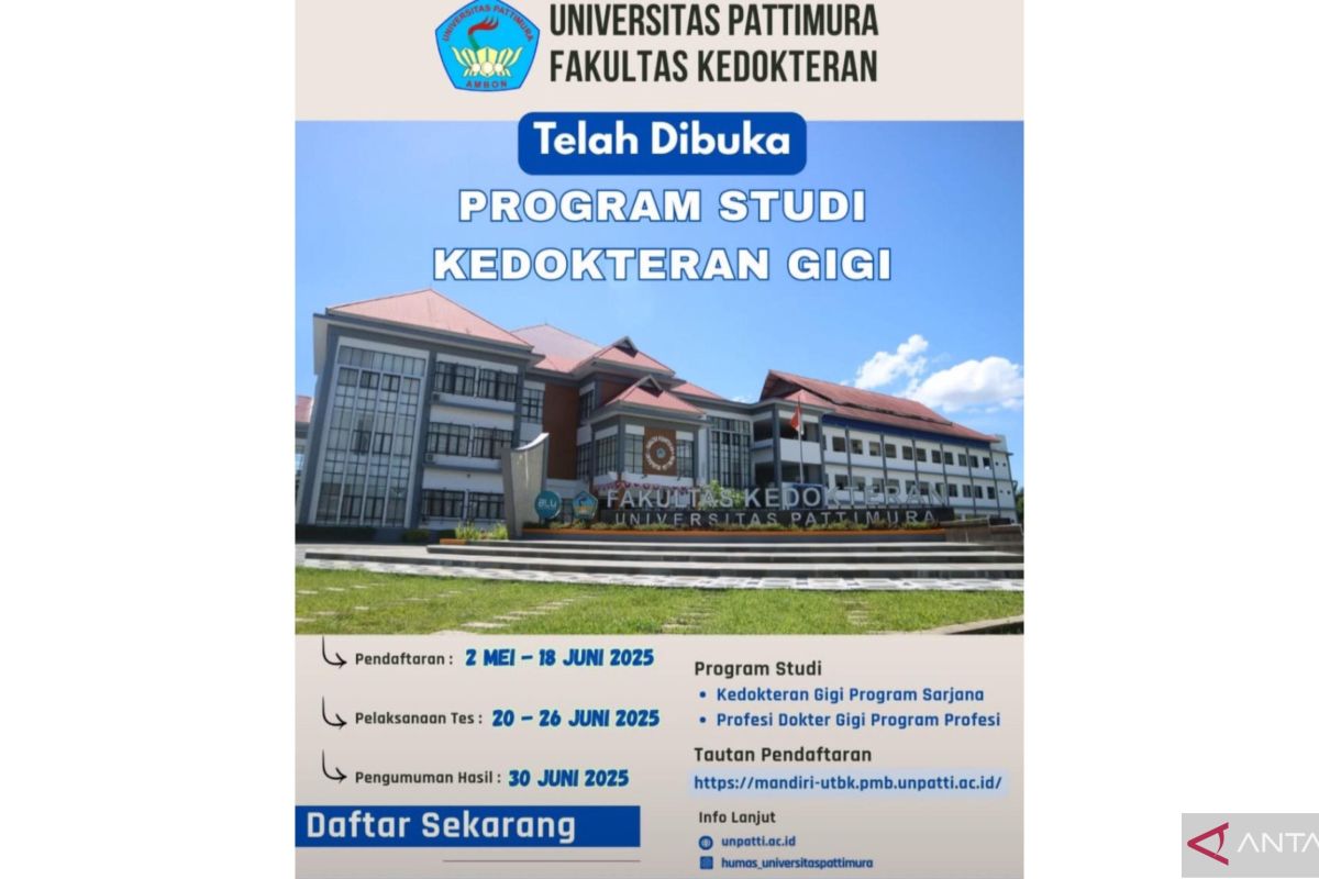 “Penerimaan mahasiswa baru Program Studi Kedokteran Gigi kini telah dibuka di Fakultas Kedokteran Universitas Pattimura melalui jalur mandiri,” kata Rektor Unpatti Prof Freddy Leiwakabessy di Ambon, Senin.