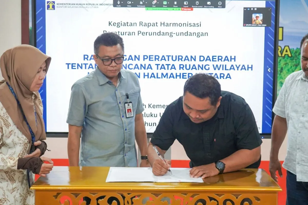 Ternate (ANTARA) - Kantor Wilayah Kementerian Hukum Maluku Utara melalui Divisi Peraturan Perundang-undangan dan Pembinaan Hukum melaksanakan rapat harmonisasi bersama Pemerintah Kabupaten Halmahera Utara terkait Rancangan Peraturan Daerah (Ranperda) tentang Rencana Tata Ruang Wilayah (RTRW) 2025–2045.