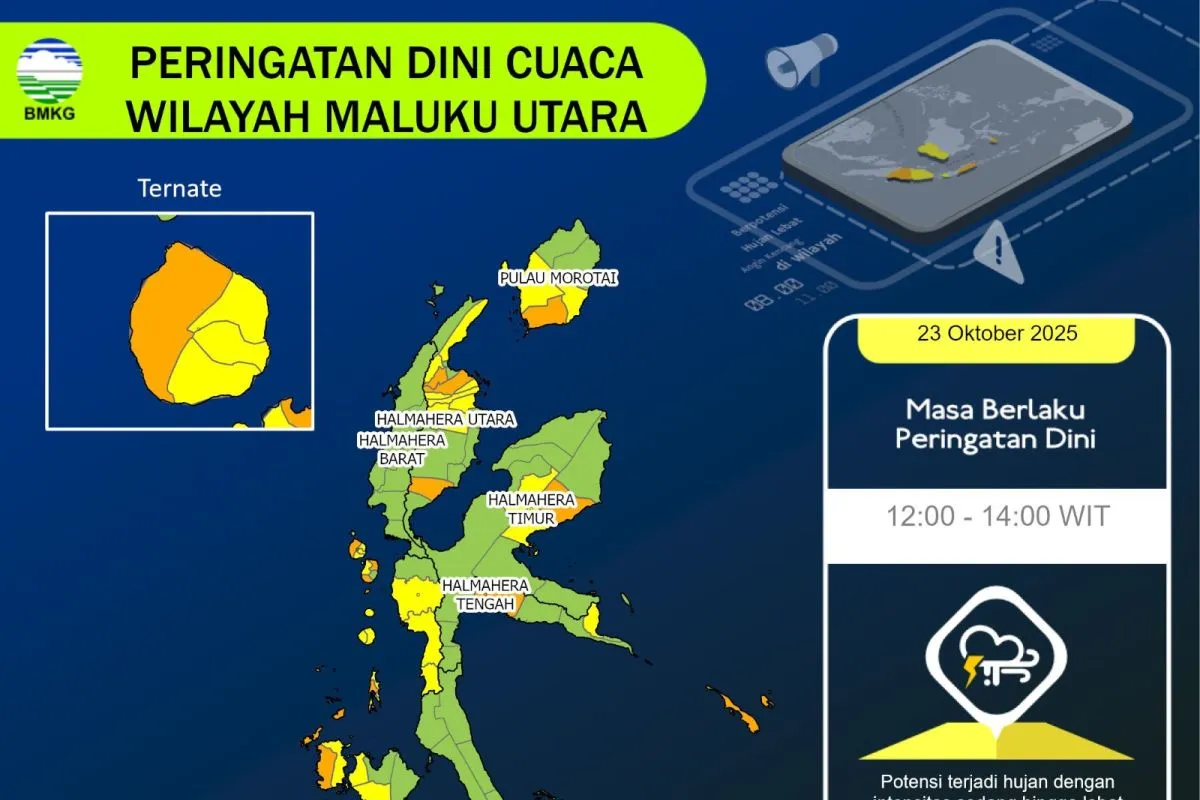 Ia merinci kondisi cuaca mulai tanggal 23–24 Oktober 2025 nampak potensi hujan sedang hingga lebat di sebagian wilayah Morotai, Halmahera Utara, Halmahera Barat, Kota Ternate, Tidore Kepulauan, Halmahera Timur, Halmahera Tengah, Halmahera Selatan, dan Kepulauan Sula.