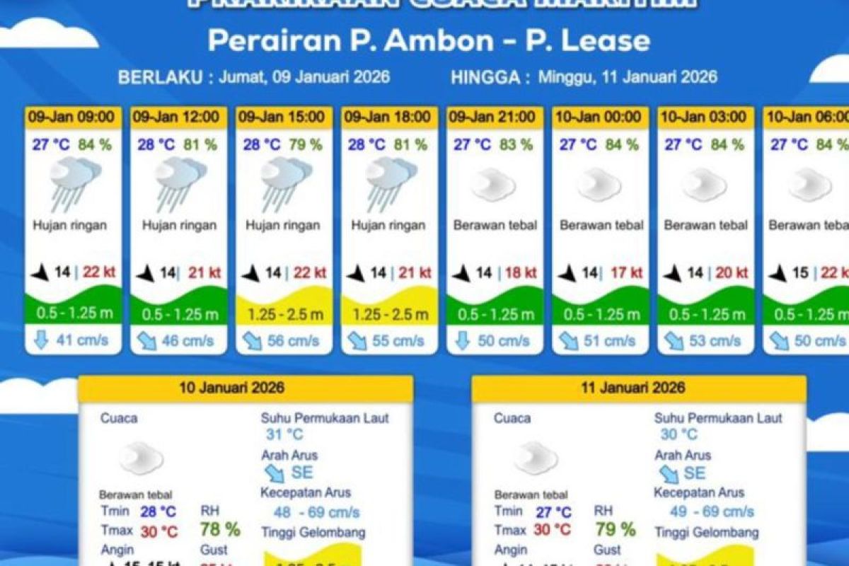 Badan Meteorologi, Klimatologi, dan Geofisika (BMKG) Stasiun Maritim Ambon mengeluarkan peringatan dini cuaca buruk yang berpotensi menimbulkan gelombang tinggi hingga empat meter di sejumlah wilayah perairan Maluku, berlaku mulai selama 8-12 Januari 2026.