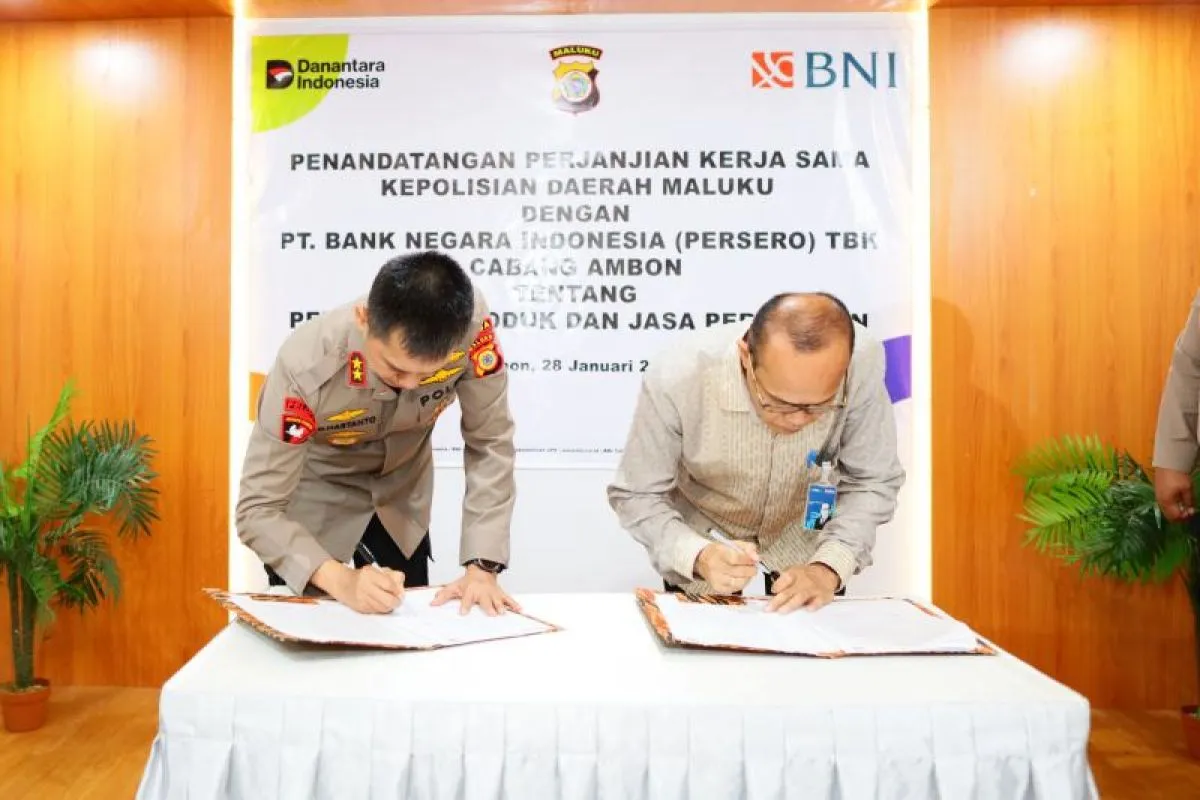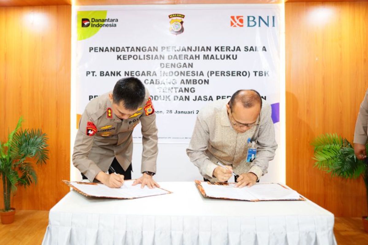 Penguatan kerja sama tersebut ditandai dengan penandatanganan perjanjian kerja sama (PKS) antara Polda Maluku dan PT BNI Cabang Ambon yang berlangsung di Kantor BNI Cabang Ambon.