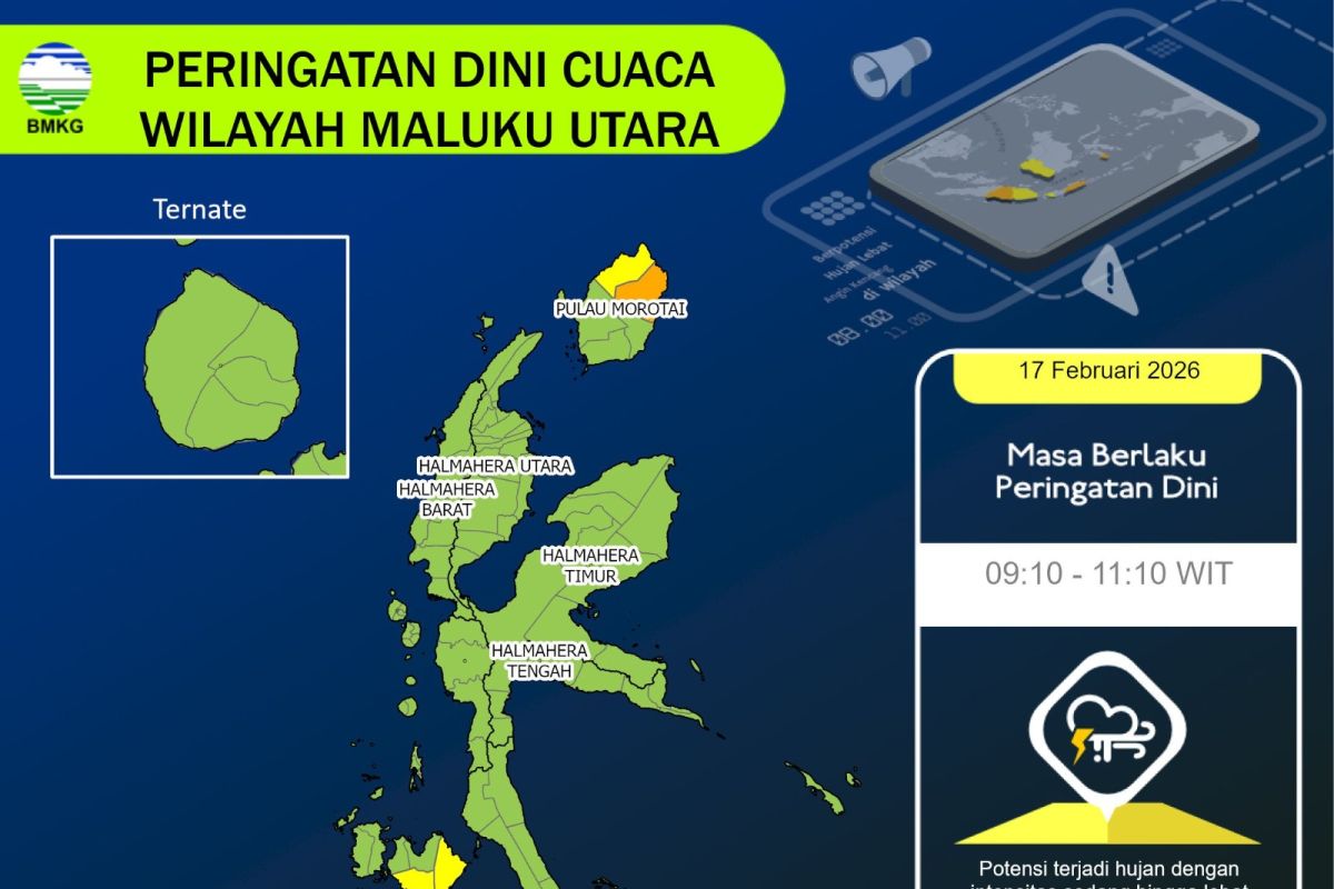 Selain itu, BMKG Wilayah Maluku Utara juga mengeluarkan update peringatan dini cuaca pada 17 Februari 2026 pukul 08.57 WIT. Dalam rilis tersebut disebutkan masih berpotensi terjadi hujan dengan intensitas sedang hingga lebat yang dapat disertai kilat/petir dan angin kencang mulai pukul 09.10 WIT.
