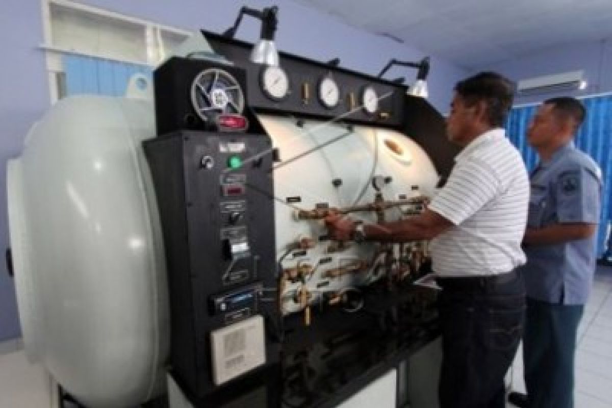 Sejumlah petugas memantau pengoperasian peralatan 'Hyperbaric Chamber' di RS TNI Angkatan Laut FX. Soehardjo, Pangkalan Utama TNI Angkatan Laut (Lantamal) IX Ambon, Maluku, Kamis (26/2). Jajaran rumah sakit tersebut berhasil melakukan perbaikan dan rekondisi 'Hyperbaric Chamber' atau kamar oksigen betekanan tinggi yang dapat digunakan untuk terapi sejumlah penykit itu setelah empat tahun tidak digunakan. ANTARA FOTO/Izaac Mulyawan/Rei/15.