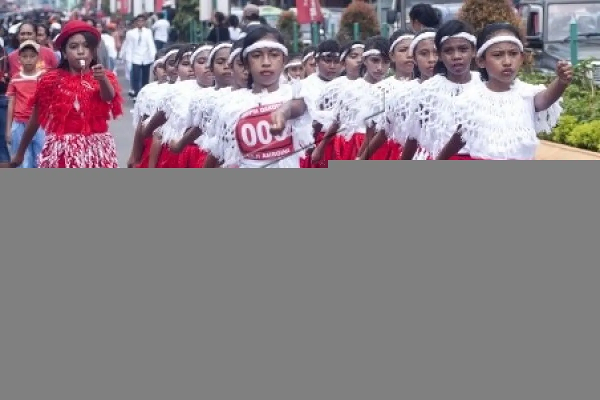 Regu anak-anak dari SD Kristen A1 Belakang Soya mengenakan busana unik saat mengikuti Lomba Gerak Jalan Indah Amboina 2015 di Kota Ambon, Maluku, Sabtu (5/9). Lomba Gerak Jalan Indah menjelang HUT ke-440 Kota Ambon ini telah dilaksanakan sejak tahun 1980 dengan keunikannya pesertanya yang menggunakan busana daerah atau busana yang dirancang sendiri. ANTARA FOTO/Embong Salampessy/foc/15.