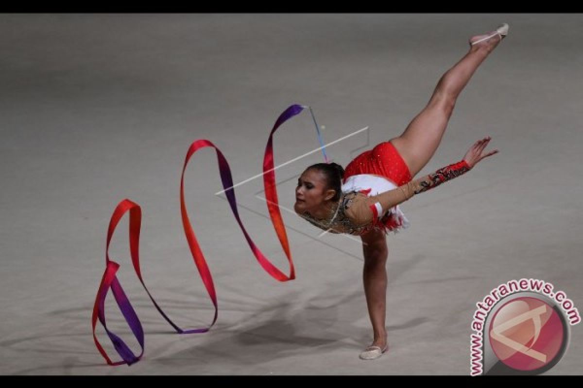1Pesenam Indonesia Nabila Evandestiera beraksi dengan alat pita dalam final senam ritmik tunggal putri all around SEA Games XXIX Kuala Lumpur di Mitec, Malaysia, Minggu (27/8). Nabila gagal meraih medali dalam nomor tersebut dan hanya meraih peringkat enam dengan skor 47,4. ANTARA FOTO/Sigid Kurniawan/foc/17. Editor: Fanny