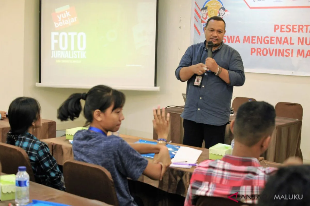 Pewarta foto Perum LKBN Antara Biro Maluku, Embong Salampessy memberikan pembekalan tentang foto jurnalistik kepada sejumlah peserta Siswa Mengenal Nusantara (SMN) 2018 di Ambon, Maluku, Rabu (15/8). Pembekalan tentang jurnalistik, foto jurnalistik dan video blog (Vlog) kepada 23 siswa SMA dan SMK serta siswa berkebutuhan khusus dari 11 kabupaten/kota di Maluku yang akan menjadi peserta SMN di provinsi Riau, diharapkan menjadi pemicu para siswa menyebarkan informasi tertangung jawab sekaligus menangkal berita bohong (hoax). ANTARA FOTO/Jimmy Ayal/18