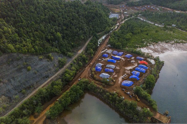 Antam nyatakan komitmen jalankan pertambangan bertanggung jawab. Foto udara sejumlah truk melakukan aktivitas pengangkutan ore nikel ke kapal tongkang di perusahan pertambangan di PT.Nusa Karya Arindo (NKA) Sub Antam Group di Desa Maba, Kabupaten Halmahera Timur, Maluku Utara, Senin (30/6/2025).PT Aneka Tambang Tbk (Antam) menyatakan komitmen menjalankan pertambangan yang bertanggung jawab melalui program keberlanjutan, salah satunya dengan menyusun peta jalan dekarbonisasi hingga 2030 dengan tujuan untuk mendorong perusahaan meningkatkan pengelolaan lingkungannya agar lebih ramah lingkungan, berkelanjutan dan transparan, serta untuk mendorong inovasi dan partisipasi masyarakat dalam pelestarian lingkungan. AntaraNews Maluku/Andri Saputra/IWY