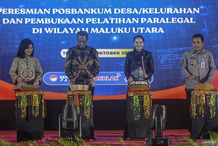 Menteri Hukum Supratman Andi Agtas (kedua kiri), Kepala Badan Pembinaan Hukum Nasional (BPHN) Kementerian Hukum Min Usehin (kiri), Gubernur Maluku Utara Sherly Laos (kedua kanan), dan Kepala Kantor Wilayah Kementerian Hukum Maluku Utara Budi Argap Situngkir (kanan) menabuh gendang saat meresmikan Pos Bantuan Hukum (Posbakum) Desa Kelurahan di Hotel Bela Ternate, Maluku Utara, Senin (13/10/2025). Sebanyak 1.185 Pos Bantuan Hukum (Posbakum) desa dan kelurahan di 38 kabupaten/kota wilayah Maluku Utara diresmikan oleh Menteri Hukum yang merupakan sebagai langkah strategis dalam perluasan akses keadilan yang inklusif bagi masyarakat. ANTARA FOTO/Andri Saputra/IWY.