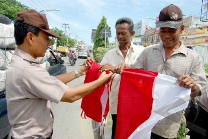 Aparat keamanan membagikan Bendera Merah Putih kepada warga di kawasan Cunda, Lhokseumawe, Aceh. Selasa (13/8). Mabes Polri melalui Polda Aceh memberikan bantuan 38 ribu lembar Merah Putih untuk di kibarkan serentak di 23 kabupaten/kota di Aceh sejak H-3 HUT RI Ke-68. ANTARA FOTO/Rahmad/ss/nz/13