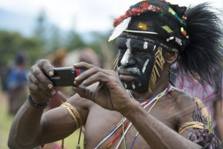 Seorang warga suku pedalaman Papua mengambil gambar dengan telepon genggamnya ketika mengikuti acara Festival Budaya Lembah Baliem ke-24 tahun 2013 hari ke-2 di Distrik Wosilimo, Kabupaten Jayawijaya, Papua, Selasa (13/8). Suku Dani, Yali and Lani berkumpul pada acara festival budaya tahunan yang berlangsung selama tiga hari ini dengan mengenakan atribut khas sukunya masing-masing menampilkan atraksi perang-perangan antar suku, musik dan tari tradisional, bakar batu dan balap babi. ANTARA FOTO/Widodo S. Jusuf/ss/nz/13