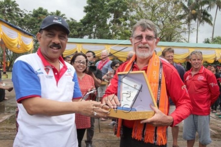 Walikota Ambon Richard Louhenapessy (kiri) menyerahkan cenderamata kepada nahkoda perahu layar �Freedom Express' Ross McCombe (kanan) saat penyambutan peserta lomba layar Darwin-Ambon Yach Race 2014 di pelataran Pattimura Park, Ambon, Maluku, Kamis (28/8). Darwin-Ambon Yacht Race 2014 diikuti 19 perahu layar yang dilepas dari Pelabuhan Darwin, Australia Utara, Sabtu (23/8) dan telah memasuki finish di Ambon, sejak Selasa (26/8). ANTARA FOTO/Izaac Mulyawan/Asf/Spt/14.